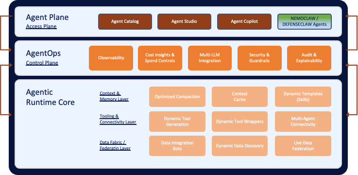 - Observability: Dual-plane visibility , security observability (DefenseClaw/Splunk) plus operational observability (Fabrix.ai) , giving enterprises complete awareness of both agent behavior and operational state.