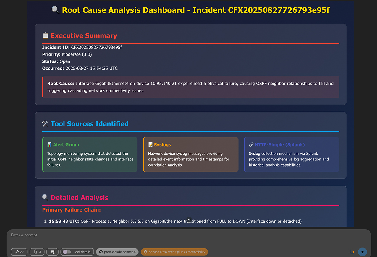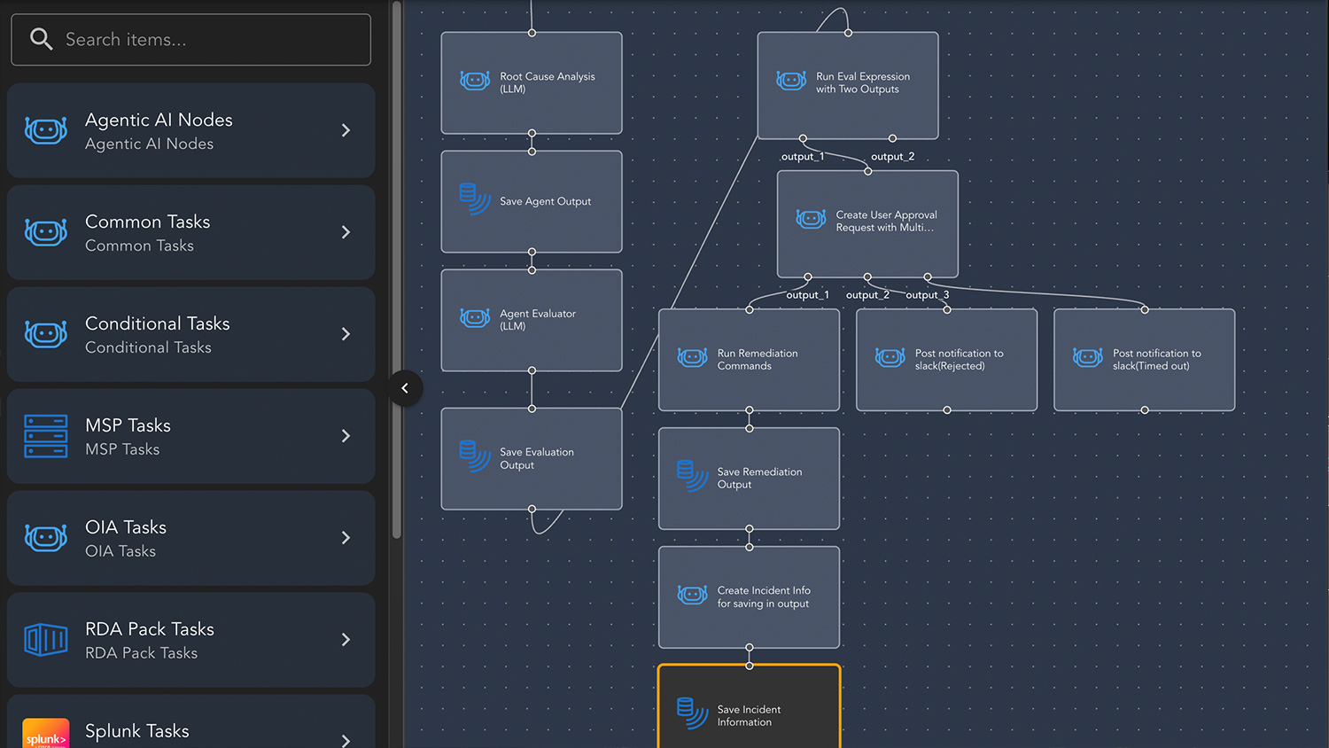 - Runs RDAF no-code pipelines or hands off to Ansible/Terraform/Cisco NSO/BPA