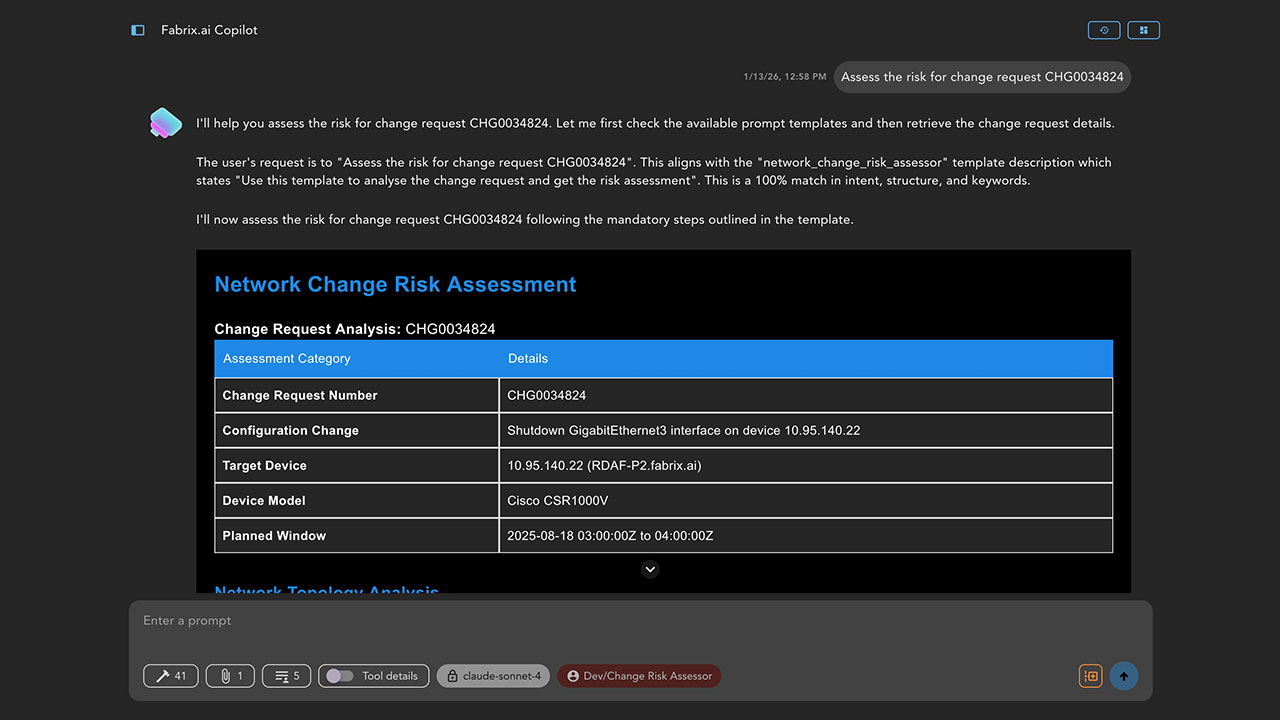 - Network Change Risk Assessment Agent: Assesses blast radius and risk before network changes are applied.