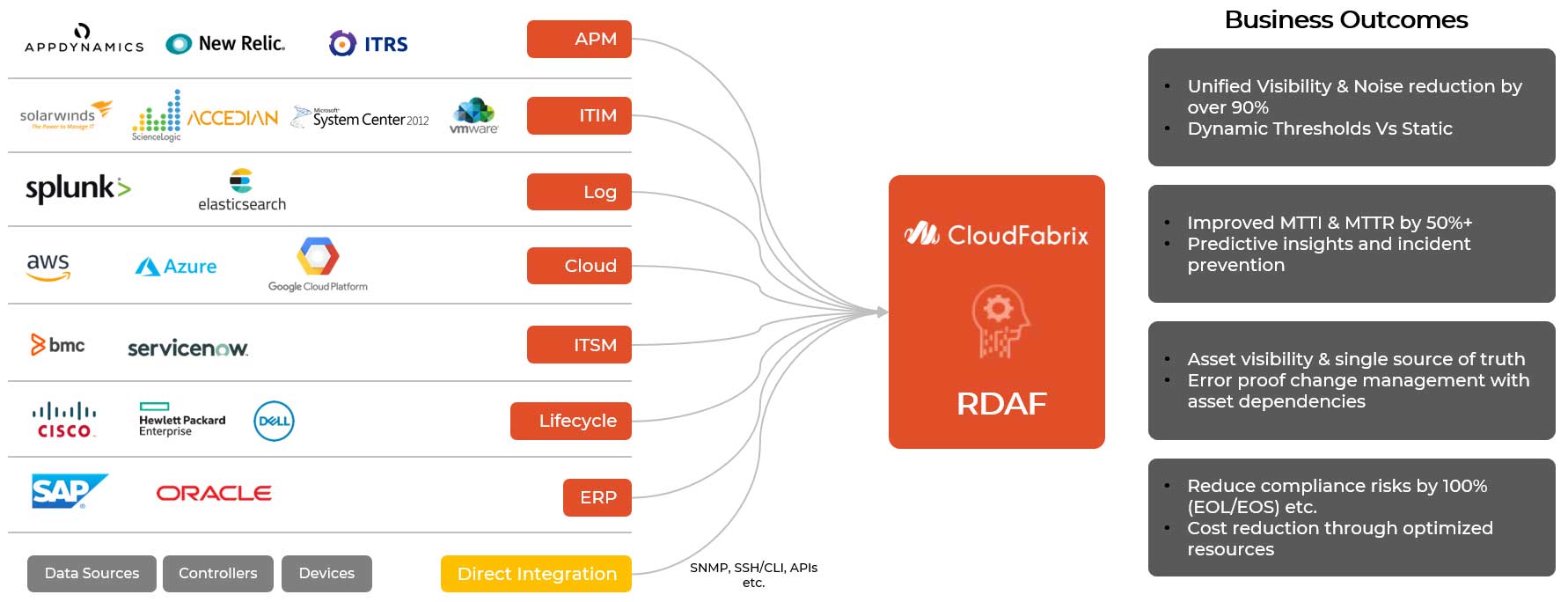 By leveraging CloudFabrix, AIOps Admins can optimize and tune downstream monitoring tools based on actionable insights and recommendations to gain real-time visibility & insights into health and outcomes of key IT assets.